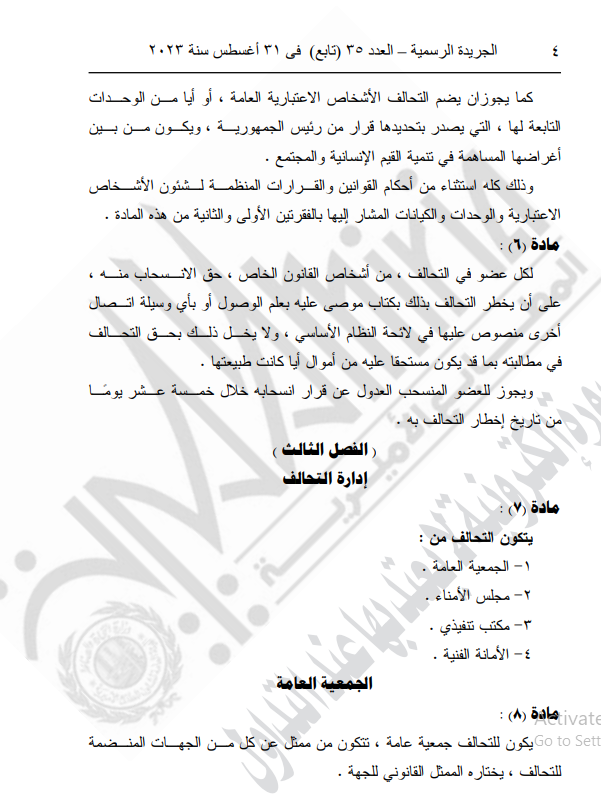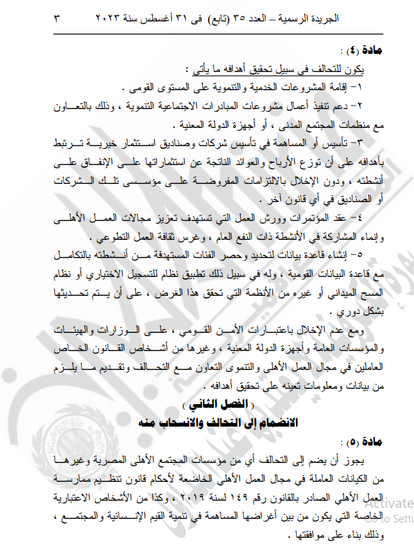 يجوز بقرار من رئيس الجمهورية إنشاء تحالف وطني للعمل الأهلى التنموى غير هادف للربح، ويكون له الشخصية الاعتبارية، ويتمتع بالاستقلال الفني والمالي والإداري ويكون مقره الرئيسي مدينة القاهرة ويجوز له إنشاء فروع ومكاتب في المحافظات الأخرى، ويشار إليه في أحكام هذا القانون بالتحالف ويجوز للتحالف إنشاء فروع له خارج جمهورية مصر العربية بموافقة رئيس الجمهورية بناء على اقتراح رئيس مجلس الأمناء وذلك وفقا للضوابط والإجراءات التى يحددها النظام.