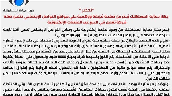 "حماية المستهلك" يُحذر من صفحة وهمية علي تنتحل صفة شركة للبيع الإلكتروني