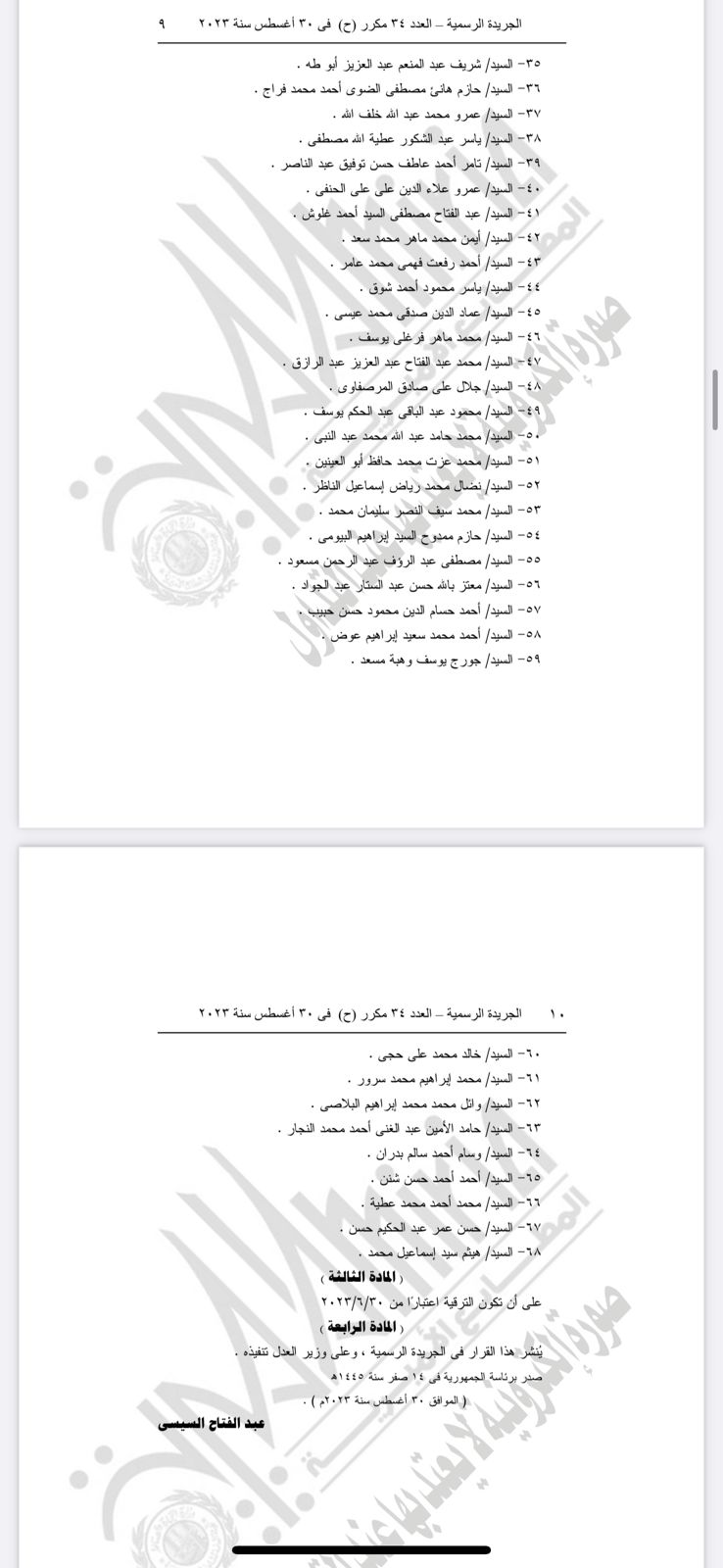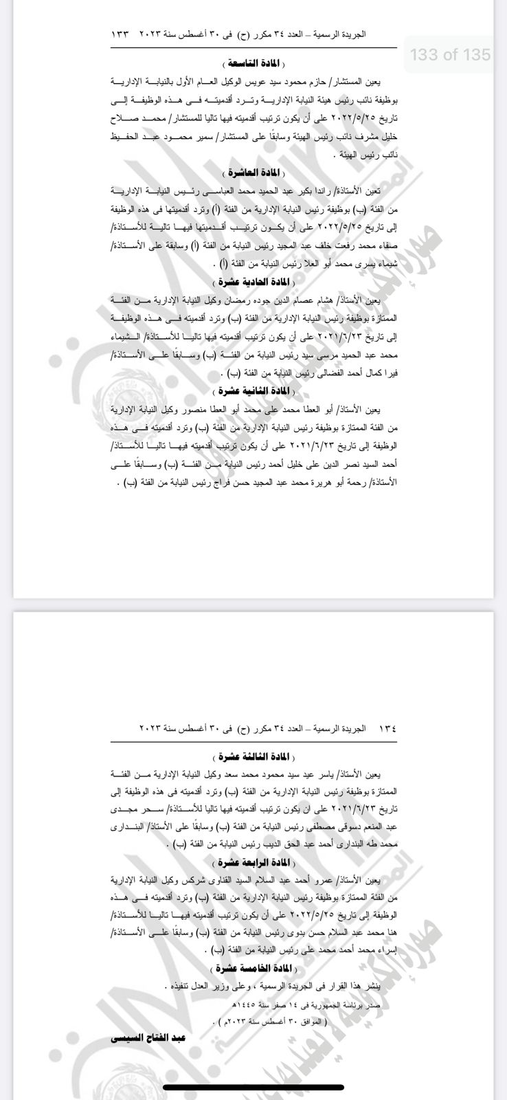 وأصدر الرئيس السيسى القرار رقم 363 لسنة 2023 بتعيين عدد من القضاة بمحكمة النقض نواب لرئيس محكمة النقض.