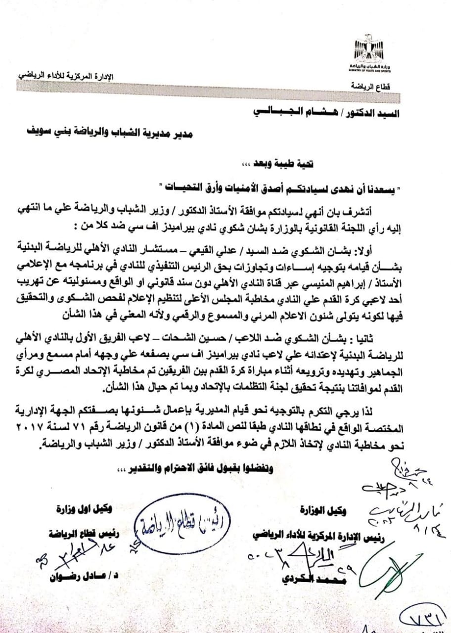 كما طالبت الوزارة، بشكل رسمي المجلس الأعلى لتنظيم الإعلام، بالتحقيق مع عدلي القيعي، رئيس شركة الكرة بالنادي الأهلي، ومقدم برنامج ملك وكتابة عبر قناة النادي الأهلي، وزميله في ذات البرنامج الصحفي إبراهيم المنيسي، بشأن التجاوزات المنسوبة إليهما في إحدى حلقات البرنامج ضد السيد المهندس ممدوح عيد الرئيس التنفيذي لنادي بيراميدز دون سند قانوني واتهامه بالمسئولية في تهريب لاعبين من النادي الأهلي دون تقديم الدليل القانوني، ما يعتبر إساءة يتوجب معها التحقيق وإحالتها للجهات المسئولة.