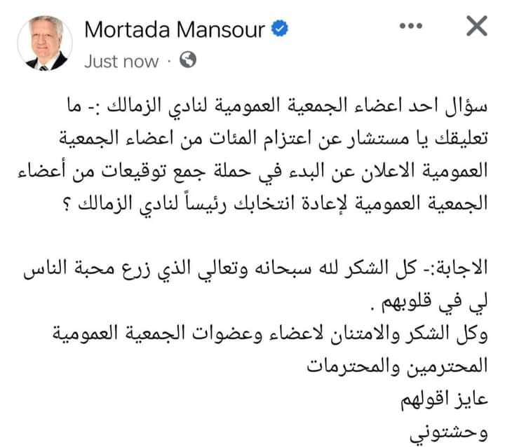 مرتضى منصور.. وكتب مرتضى: «سؤال أحد الصحفيين من أعضاء الجمعية العمومية لنادي الزمالك: ما تعليقك يا مستشار على اعتزام المئات من اعضاء الجمعية العمومية الاعلان عن البدء في حملة جمع توقيعات من أعضاء الجمعية العمومية لإعادة انتخابك رئيسًا لنادي الزمالك؟».