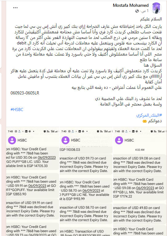 وتابع صاحب المشكلة مع بنك HSBC ، "السؤال هنا كريدت كارد متعملوش أكتيڤ ولا باسورد ولا تمت عليه أي معاملة قبل كدة يتعمل عليه هاكر أزاااااااي مع بنك كبير زي أتش إس بي سي غير أن بيانات العملاء بتتسرب أو مافيش عامل أمان كفاية علي العموم أنا عملت أعتراض - ده رقمه اللي بتابع بيه