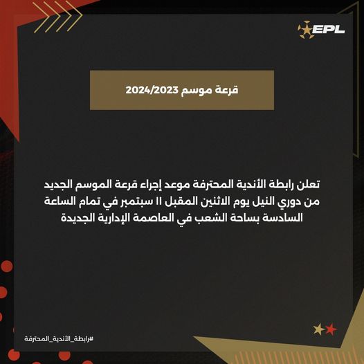ونص بيان الرابطة على النحو التالي: تعلن رابطة الأندية المحترفة إجراء قرعة الموسم الجديد من دوري النيل، يوم الاثنين الموافق 11 سبتمبر في تمام الساعة السادسة مساءً في ساحة الشعب بالعاصمة الإدارية الجديدة.