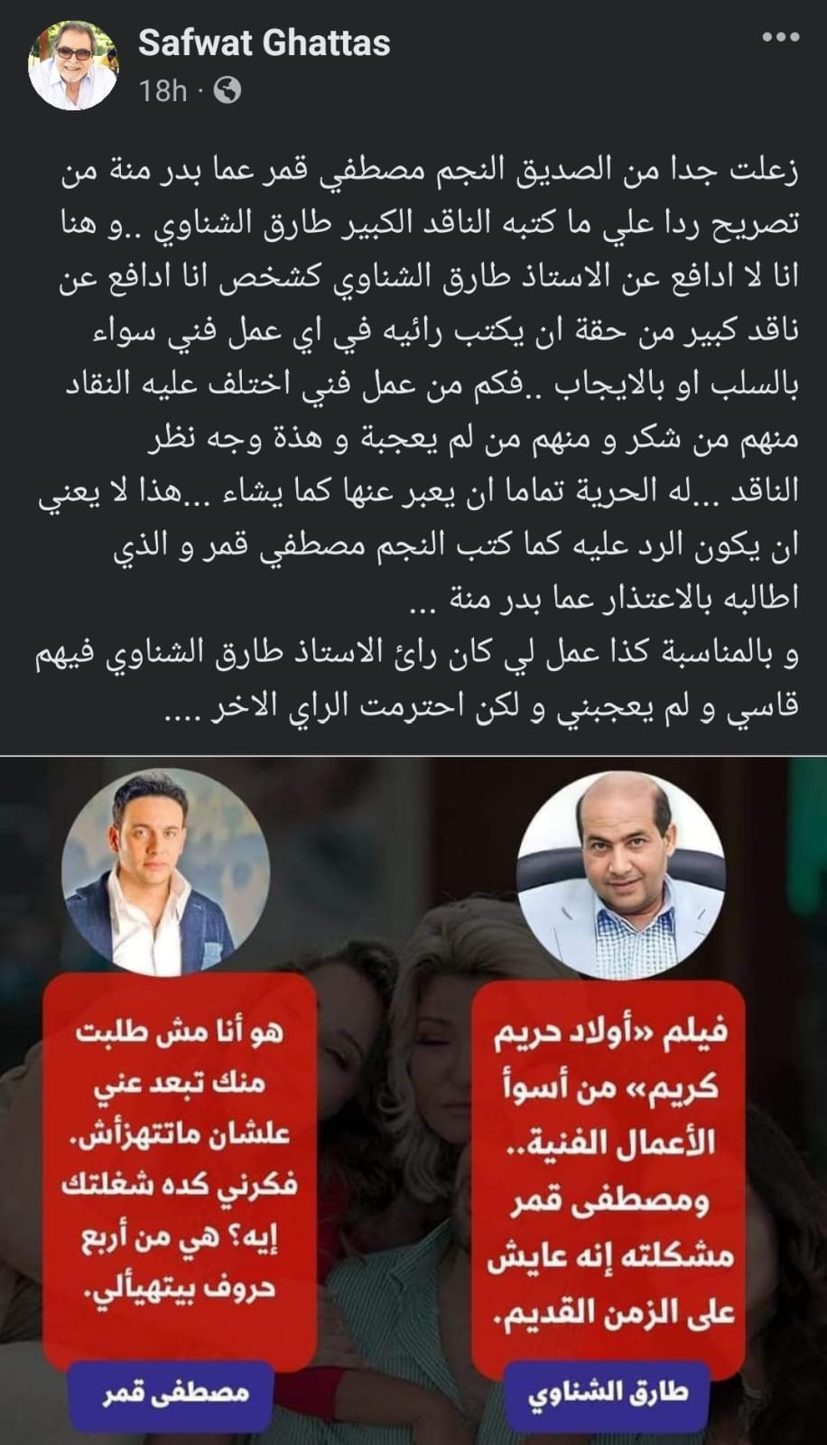 علق المنتج صفوت غطاس على الأزمة التي دارت بين الفنان مصطفى و الناقد طارق الشناوي و ذلك بعد هجوم الشناوي على فيلم “ أولاد حريم كريم ” و رد مصطفى قمر عليه، و ذلك من خلال منشور كتبه غطاس على صفحته الرسمية عبر موقع التواصل الاجتماعي “ فيسبوك ” .