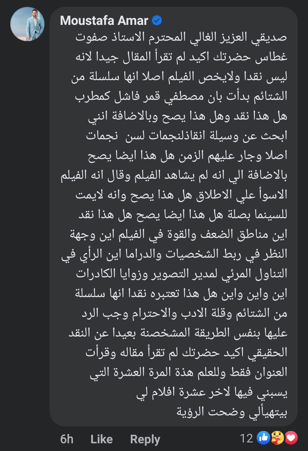 علق الفنان مصطفى قمر على منشور المنتج صفوت غطاس قائلا “ صديقي العزيز الغالي المحترم صفوت غطاس حضرتك أكيد لم تقرأ المقال جيدا لأنه ليس نقدا و لا يخص الفيلم أصلا، أنها سلسلة من الشتائم بدأت بأن مصطفى قمر فاشل كمطرب هل هذا نقد و هل هذا يصح و بالاضافة أنني أبحث عن وسيلة انقاذ لنجمات لسن نجمات أصلا و جار عليهم الزمن، هل هذا يصح أيضا ”