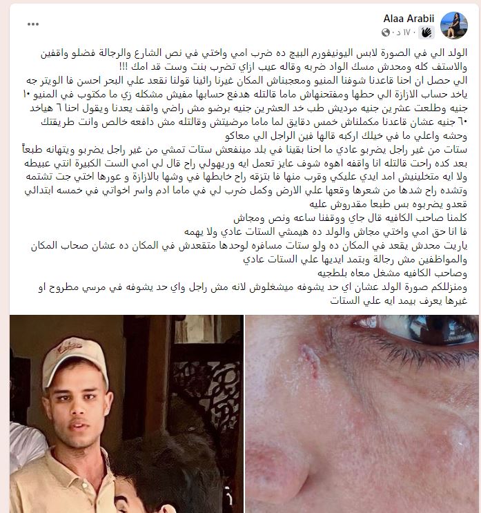 وقالت صاحبة الواقعة،" الولد الي في الصورة لابس اليونيفورم البيچ ده ضرب امي واختي في نص الشارع والرجالة فضلو واقفين والاستف كله ومحدش مسك الواد ضربه وقاله عيب ازاي تضرب بنت وست قد امك !!!الي حصل ان احنا قاعدنا شوفنا المنيو ومعجبناش المكان غيرنا رائينا قولنا نقعد علي البحر احسن فا الويتر جه ياخد حساب الازازة الي حطها ومفتحنهاش ماما قالتله هدفع حسابها مفيش مشكله زي ما مكتوب في المنيو 10 جنيه وطلعت عشرين جنيه مرديش طب خد العشرين جنيه برضو مش راضي واقف يعدنا ويقول احنا ٦ هياخد 60 جنيه عشان قاعدنا مكملناش خمس دقايق لما ماما مرضيتش وقالتله مش دافعه خالص وانت طريقتك وحشه واعلي ما في خيلك اركبه قالها فين الراجل الي معاكو ".