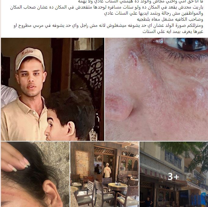 وتابعت " ستات من غير راجل يضربو عادي ما احنا بقينا في بلد مينفعش ستات تمشي من غير راجل يضربو ويتهانه طبعاًبعد كده راحت قالتله انا واقفه اهوه شوف عايز تعمل ايه وريهولي راح قال لي امي الست الكبيرة انتي عبيطه ولا ايه متخلينيش امد ايدي عليكي وقرب منها فا بتزقه راح خابطها في وشها بالازازة و عورها اختي جت تشتمه وتشده راح شدها من شعرها وقعها علي الارض وكمل ضرب لي في ماما ادم واسر اخواتي في خمسه ابتدائي قعدو يضربوه بس طبعا مقدروش عليه كلمنا صاحب الكافيه قال جاي ووقفنا ساعه ونص ومجاش فا انا حق امي واختي مجاش والولد ده هيمشي الستات عادي ولا يهمه ياريت محدش يقعد في المكان ده ولو ستات مسافره لوحدها متقعدش في المكان ده عشان صحاب المكان والمواظفين مش رجالة وبتمد ايديها علي الستات عادي وصاحب الكافيه مشغل معاه بلطجيه ومنزللكم صورة الولد عشان اي حد يشوفه ميشغلوش لانه مش راجل واي حد يشوفه في مرسي مطروح او غيرها يعرف بيمد ايه علي الستات".