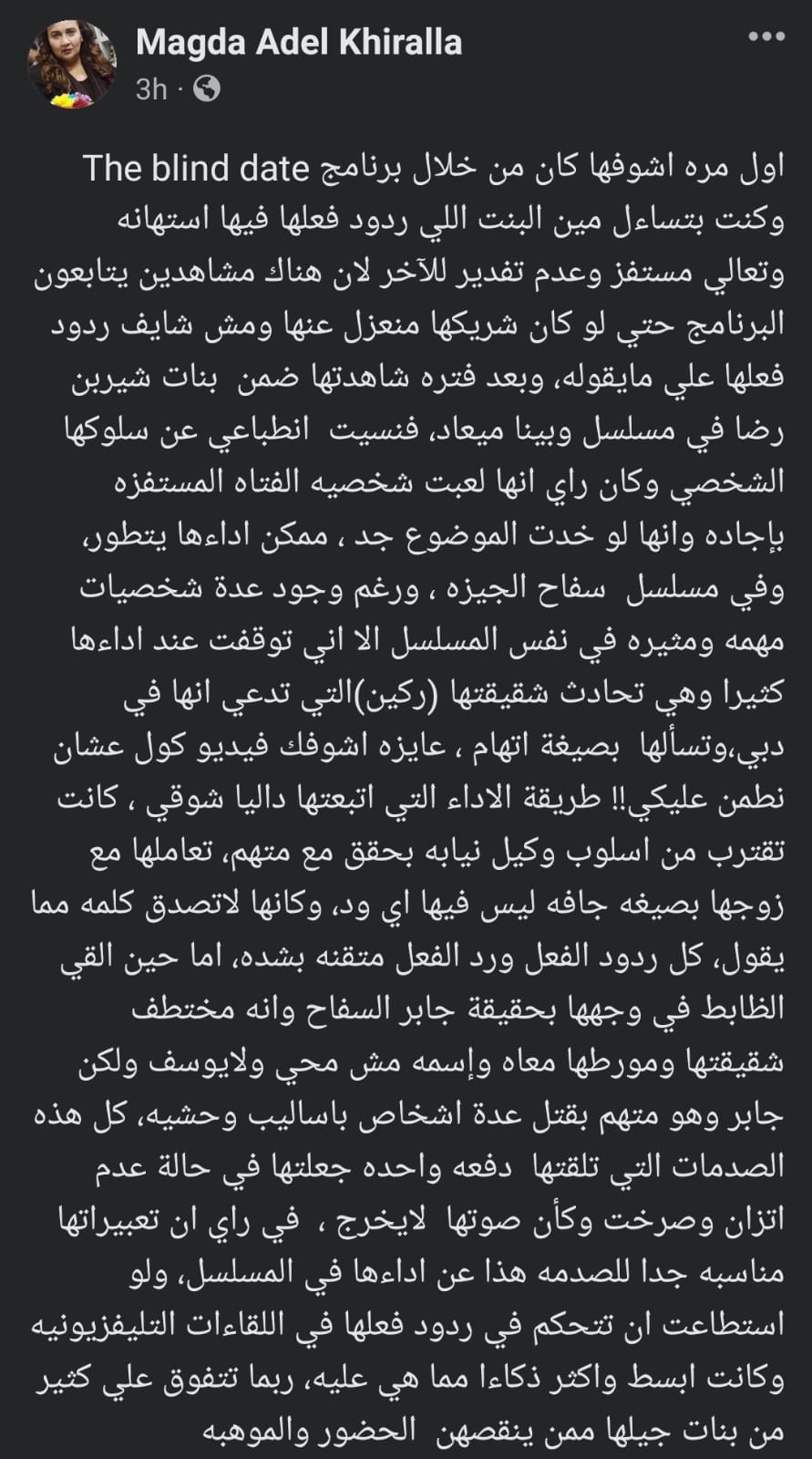 كتبت ماجدة خير الله منشور عبر صفحتها على موقع التواصل الاجتماعي “ فيسبوك ” و علقت : “ أول مرة أشوفها كان من خلال برنامج The Blind Date و كنت بتساءل مين البنت اللي ردود فعلها فيها استهانة و تعالي مستفز و عدم تقدير للآخر لأن هناك مشاهدين يتابعون البرنامج حتى لو كان شريكها منعزل عنها و مش شايف ردود فعلها على ما يقوله، و بعد فترة شاهدتها ضمن بنات شيرين رضا في مسلسل و بيننا ميعاد، فنسيت انطباعها عن سلوكها الشخصي، و كان رأيي أنها لعبت شخصية الفتاة المستفزة باجادة و أنها لو خدت الموضوع جد، ممكن أداءها يتطور ” .