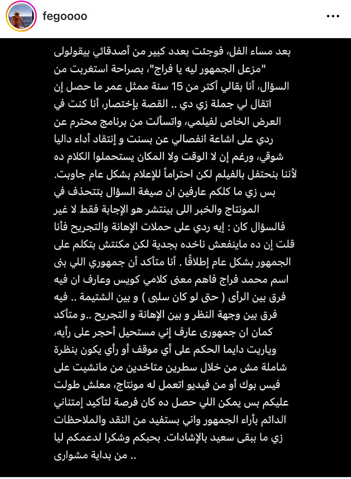 واختتم: “معلش طولت عليكم بس يمكن اللي حصل ده كان فرصة لتأكيد أمتناني الدائم بآراء الجمهور وإني بستفيد من النقد والملاحظات زي ما ببقى سعيد بالإشادات..بحبكم وشكرا لدعمكم ليا من بداية مشوارى”.