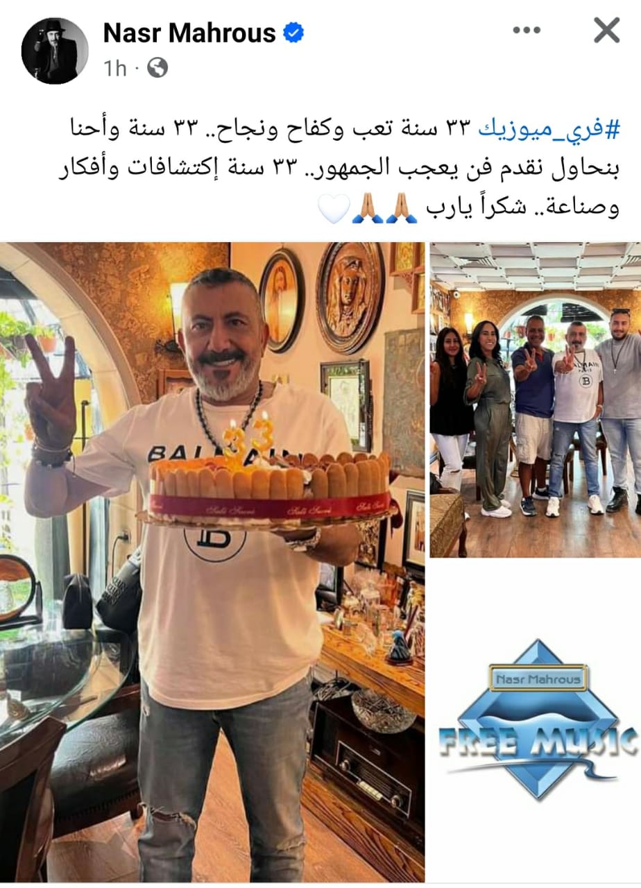 يحتفل المنتج نصر محروس بمرور 33 عام على تأسيس شركة “ فري ميوزك ” و ذلك من خلال منشور كتبه على صفحته الرسمية عبر موقع التواصل الاجتماعي “ فيسبوك ” .