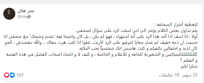 وكتب عمر هلال، عبر صفحته على موقع التواصل الإجتماعي “الفيسبوك” قائلا:" يتم تداول بعض الكلام يؤشر الى اني اسئت الرد على سؤال لصحفي، أولا : انا اسف اذا أخد هذا الرد على أنه استهزاء ، فهو لم يكن ، بل كان واضحا فيه 'عشم وضحك' مع صحفي انا حسيت ان دمه خفيف لم عمل معايا انترفيو على الرد كاربت. عفوا اذا كنت هزرت معاك .. والله مقصدش".