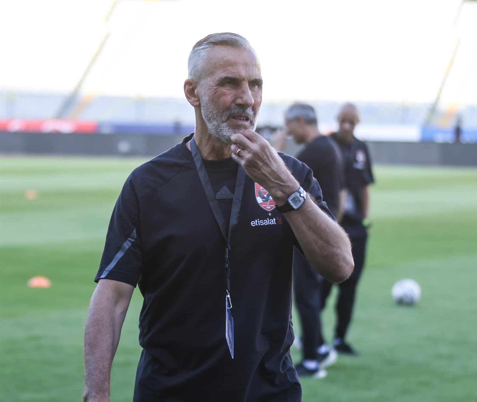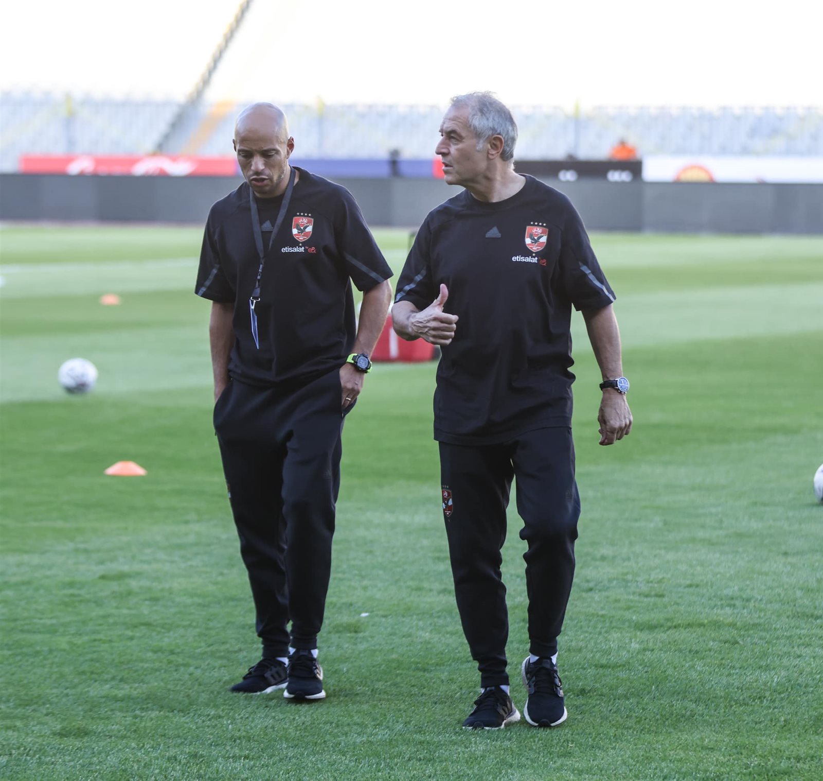 الجهاز الفني للأهلي يعاين أرض الملعب قبل انطلاق مباراة المصري بالدوري الممتاز