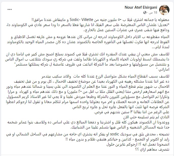 وتابع صاحب المشكلة مع سوديك،" للاسف مش معني ان يبقي عندك المقدره انك تشتري ڤيلا في كمبوند بمبلغ اصبح مش كبير في ايامنا دي ان دا يضمنلك ابسط اولويات الحياه (المياه و الكهرباء) طالما وثقت في شركه زي سودك بتتلاعب ب اموال الناس و بتتنصل من مسؤوليتها و خصوصا بعد ما الشركة اتباعت في ظروف غامضة ل شركه يمتلكها مستثمر" اماراتي " للاسف بسبب انقطاع المياه بشكل متواصل الزرع عندنا كله مات والاند سكيب بيتدمر ده غير اننا عندنا مشكله رهيبه في الكهرباء بعيدا عن موضةع تخفيف الاحمال ، كل يوم و من قبل تخفيف الاحمال ب شهور بيتم قطع المياه و النور عننا مع العلم ان الكمبوند الي علي يمينا و شمالنا عندهم مياه ونور مع انهم اسعارهم ارخص مننا (يعني الڤلل مثلا ب اقل من 20 مليون) و مع ذلك عندهم مياه و كهرباء و مرارا وتكرارا تم التواصل مع مسؤولين كثيرون بالشركة وطبعا ميردش علينا و لا يجي لنا غير الاستاذ كريم المسؤول عن العلاقات العامه و خدمه العملاء و اخر مره بعتولنا واحده اسمها مرام تتكلم معانا و تقول لنا ارجوكم اعطوا الشركه فرصه انها تثبت انها بالفعل عايزه تحل و عايزه تريح الناس علي الرغم من اننا بقالنا 3 سنين بنديهم في فرص".