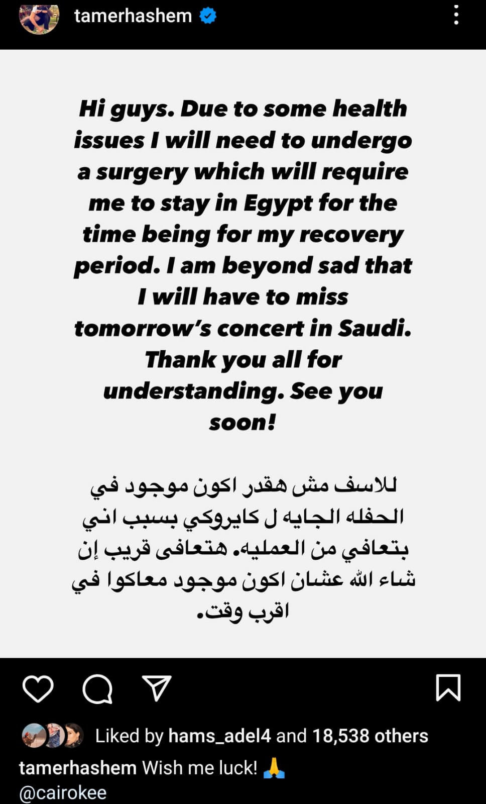 و أعلن الفنان تامر هاشم أنه لن يتواجد بالحفل حيث و ذلك من خلال منشور كتبه على صفحته الرسمية عبر موقع تبادل الصور و الفيديوهات “ انستجرام ” حيث علق قائلا “ للأسف مش هقدر أكون موجود في الحفلة الجاية لكايروكي بسبب أني بتعافى من عملية، هتعافى قريب ان شاء الله علشان أكون موجود معاكم في أقرب وقت ” .