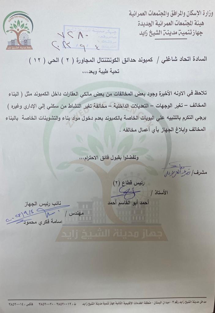 وخاطب جهاز مدينة الشيخ زايد اتحاد الشاغلين بالكمبوند بعد مراقبة الوضع داخل المجمع السكني والتأكد من شكوي الأهالي، مؤكداً على أنه تلاحظ في الأونة الأخيرة للجهاز وجود بعض المخالفات من بعض مالكي العقارات داخل الكمبوند مثل مخلفات البناء وتغير الواجهات والتعديلات الداخلية ومخالفة تغير النشاط من سكني إلى إداري وغيره، مطالباً بعد دخول أي سيارات مواد بناء والتشوينات الخاصة بالبناء المخالف وإبلاغ الجهاز بأى أعمال مخالفة .