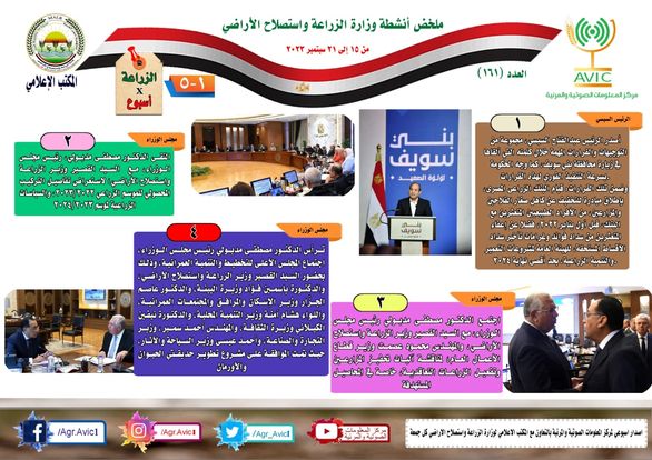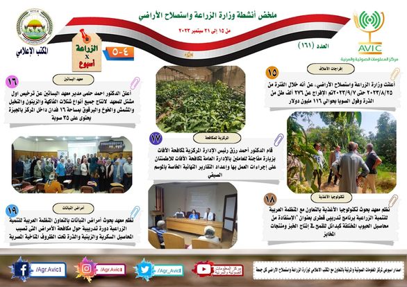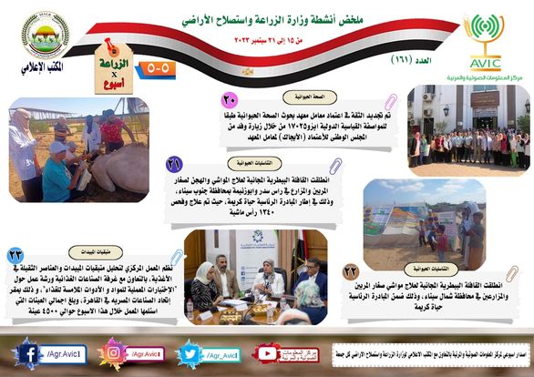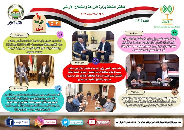 أصدر مركز المعلومات الصوتية والمرئية، التابع لوزارة الزراعة واستصلاح الاراضي، “الانفوجراف الاسبوعي” في نسخته رقم 161 ، حول الحصاد الاسبوعي لأهم أنشطة الوزارة، خلال الاسبوع الماضي في الفترة من 15 وحتى 21 سبتمبر الجاري، وذلك بالتعاون مع المكتب الاعلامي للوزارة، كما أصدر المركز ايضا ملخصا بالفيديو، حول انشطة الوزارة خلال نفس الفترة.