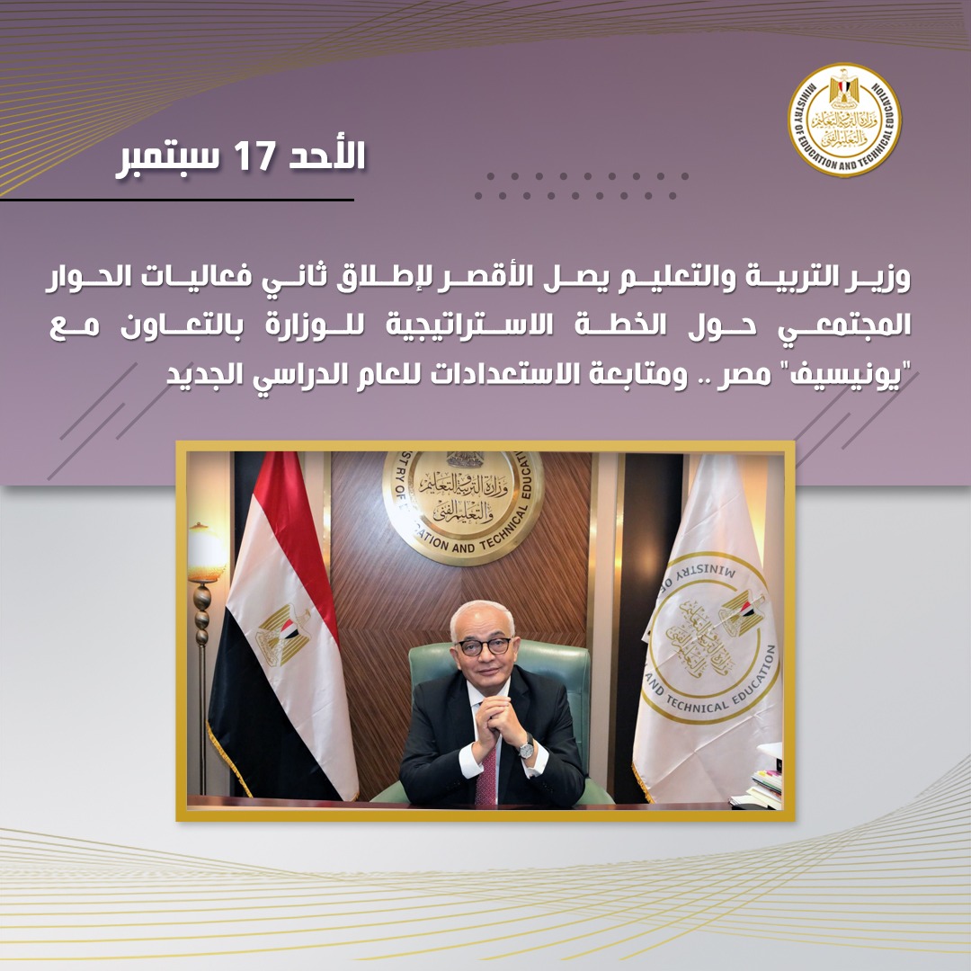 شهد الدكتور رضا حجازى وزير التربية والتعليم والتعليم الفنى، إطلاق ثاني فعاليات الحوار المجتمعى حول الخطة الاستراتيجية لوزارة التربية والتعليم والتعليم الفني  للأعوام من (۲۰۲٤-۲۰۲۹)، وذلك بمحافظة الأقصر بالتعاون مع منظمة يونسيف مصر، وذلك بمشاركة واسعة لكافة الأطراف ذات الصلة بالعملية التعليمية.