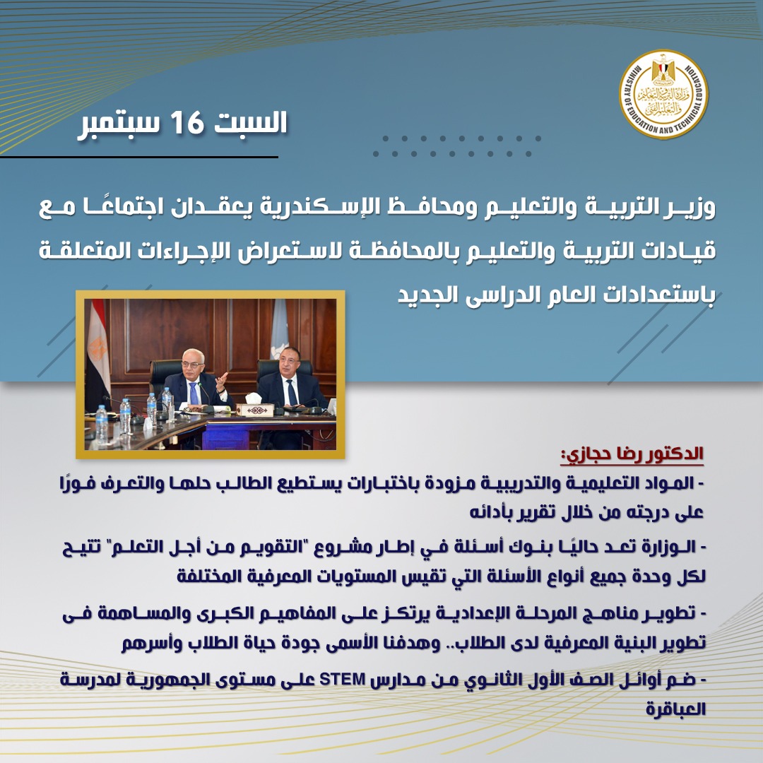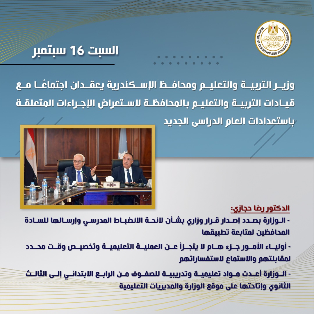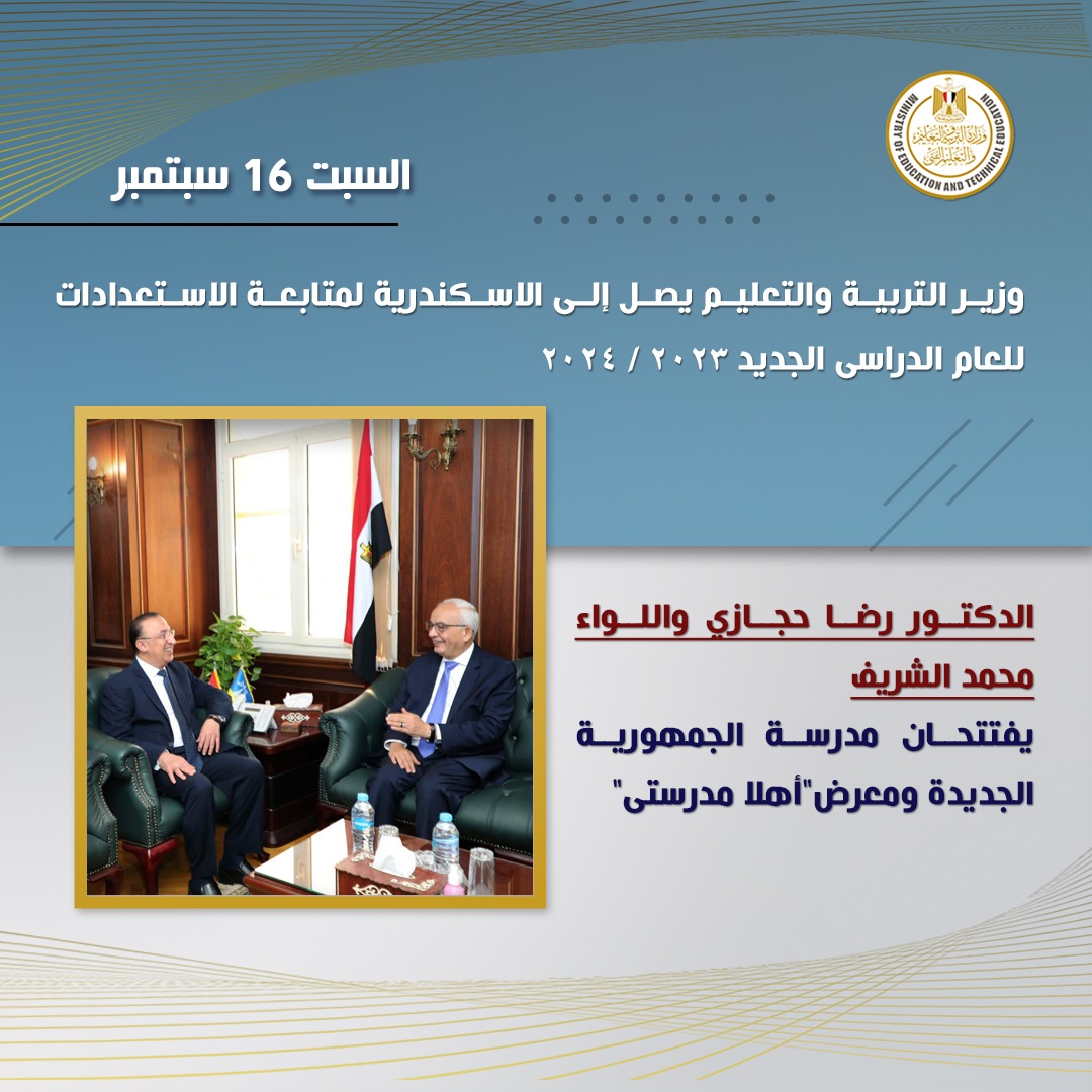 قام الدكتور رضا حجازي وزير التربية والتعليم والتعليم الفني بزيارة إلى محافظة الأسكندرية لمتابعة الاستعدادات في مدارس المحافظة للعام الدراسي الجديد ٢٠٢٣ / ٢٠٢٤.