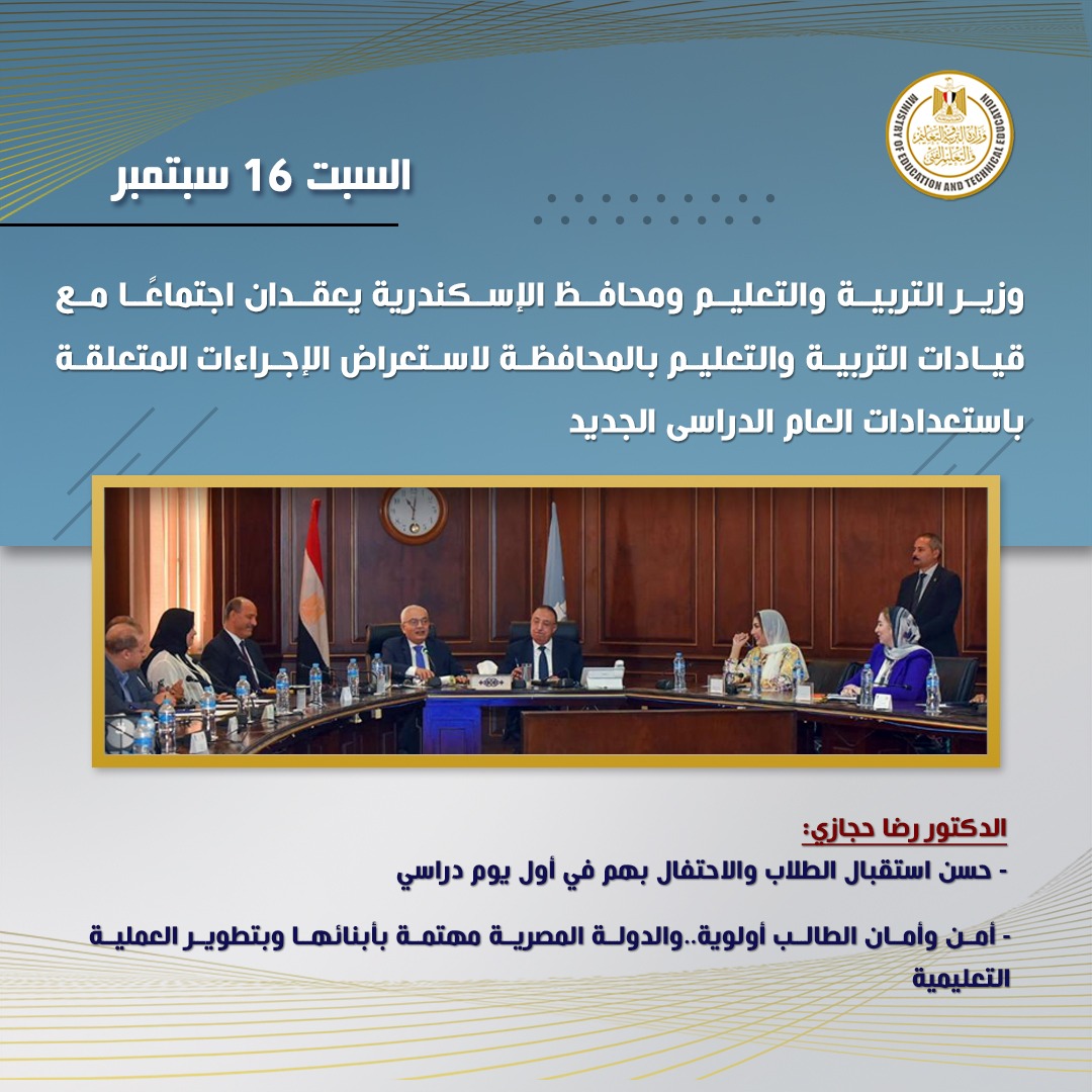 عقد الدكتور رضا حجازي وزير التربية والتعليم والتعليم الفني، واللواء محمد الشريف محافظ الإسكندرية اجتماعًا مع قيادات التربية والتعليم، ومديرى الإدارات التعليمية بالمحافظة؛ لاستعراض الاجراءات المتعلقة باستعدادات العام الدراسى الجديد.