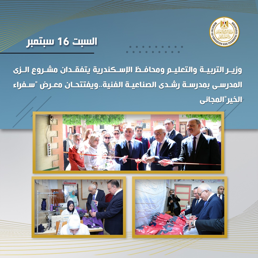 وتفقد الدكتور رضا حجازى وزير التربية والتعليم الفنى، واللواء محمد الشريف محافظ الإسكندرية، مشروع الزى المدرسى بمدرسة رشدى الصناعية الفنية للبنات التابعة لإدارة شرق الإسكندرية، وذلك فى إطار متابعة استعدادات العام الدراسي الجديد ٢٠٢٣/٢٠٢.