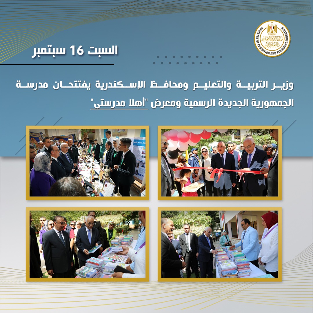فى إطار متابعة استعدادات العام الدراسي الجديد ٢٠٢٣/٢٠٢، قام الدكتور رضا حجازى وزير التربية والتعليم الفنى، واللواء محمد الشريف محافظ الإسكندرية، بتفقد عدد من المشروعات التعليمية بالمحافظة، حيث افتتحا مجمع مدارس الجمهورية الجديدة الرسمية، ومعرض "أهلا مدرستى" بالمحافظة.