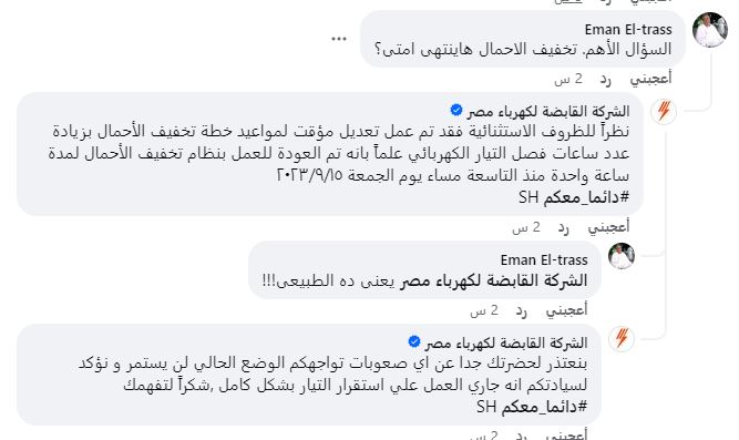 وقالت الشركة ردا على سؤال تلقته عبر صفحتها على "فيسبوك" بِشأن انتهاء خطة تخفيف الأحمال:"بنعتذر عن أي صعوبات تواجهكم، الوضع الحالي لن يستمر، و نؤكد أنه جاري العمل على استقرار التيار بشكل كامل، شكراً لتفهمك"، وتابعت الشركة " نظراً للظروف الاستثنائية فقد تم عمل تعديل مؤقت لمواعيد خطة تخفيف الأحمال بزيادة عدد ساعات فصل التيار الكهربائي علماً بانه تم العودة للعمل بنظام تخفيف الأحمال لمدة ساعة واحدة منذ التاسعة مساء يوم الجمعة 15-9-2023".