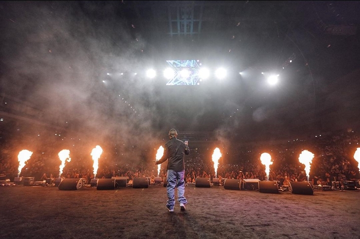 وظهر أحمد سعد على جمهوره بإطلالة شبابية تكونت من البنطلون الجينز الأزرق وقميص أسود بالإضافة إلى حذاء رياضي أبيض.