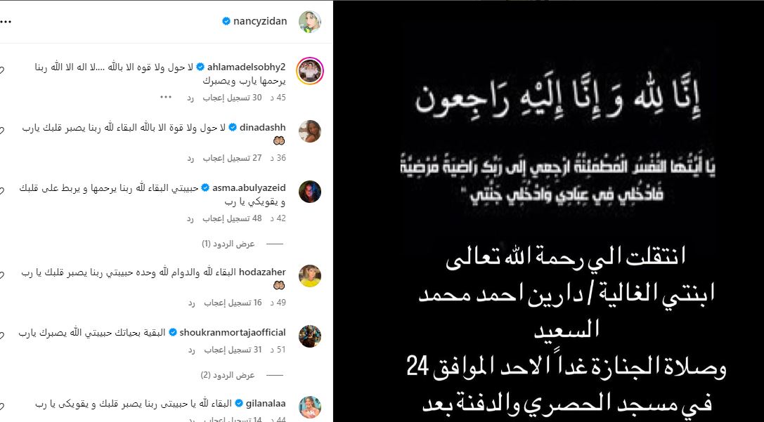وانهالت على نانسى التعازى من أصدقائها والبلوجرز ونجوم الفن داعين الله لها بالقوة والصبر على فراق ابنتها.