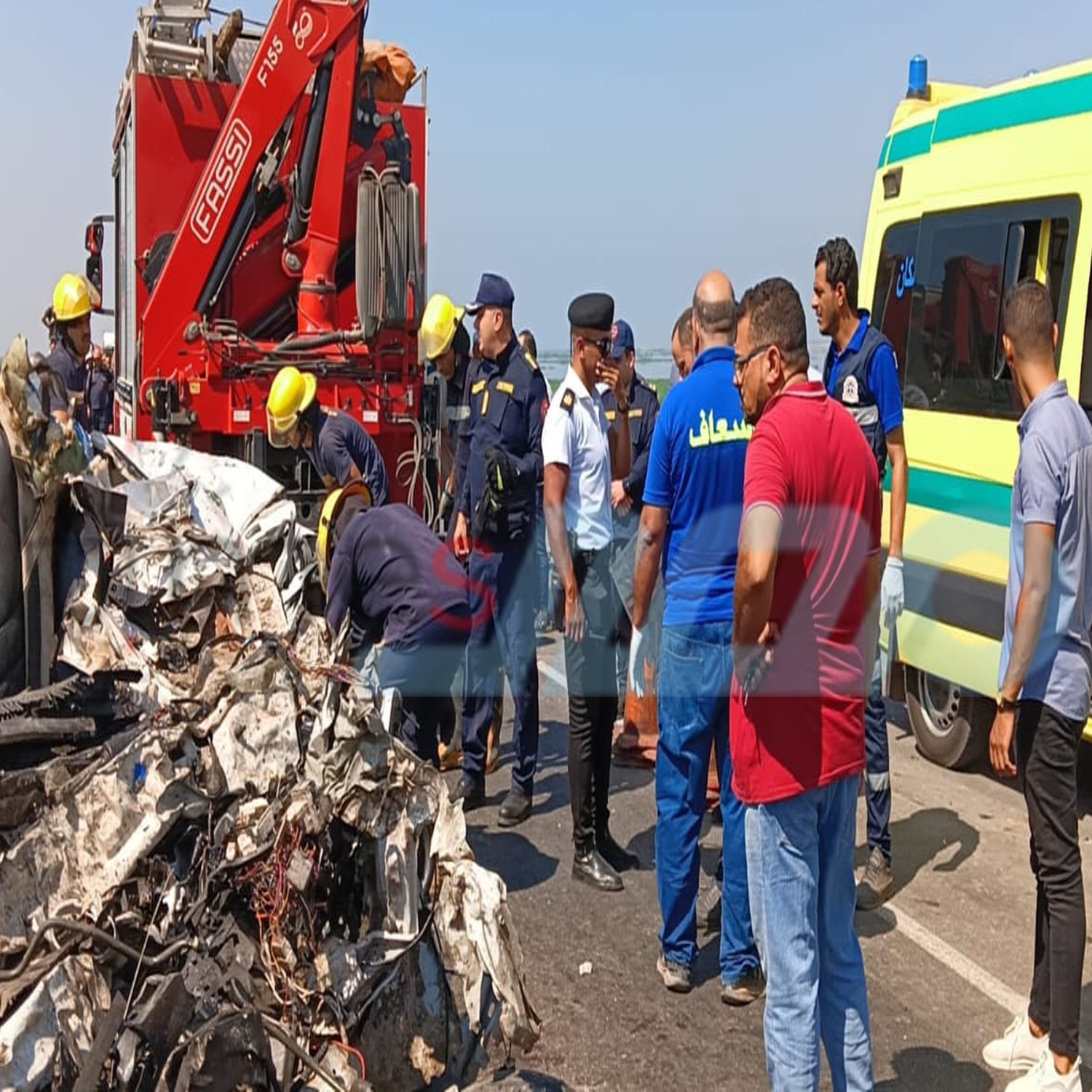 الحماية المدنية ببورسعيد تُخرج جثمانين من سيارة دهستها مقطورة بطريق المنزلة وفر هاربًا (صور)