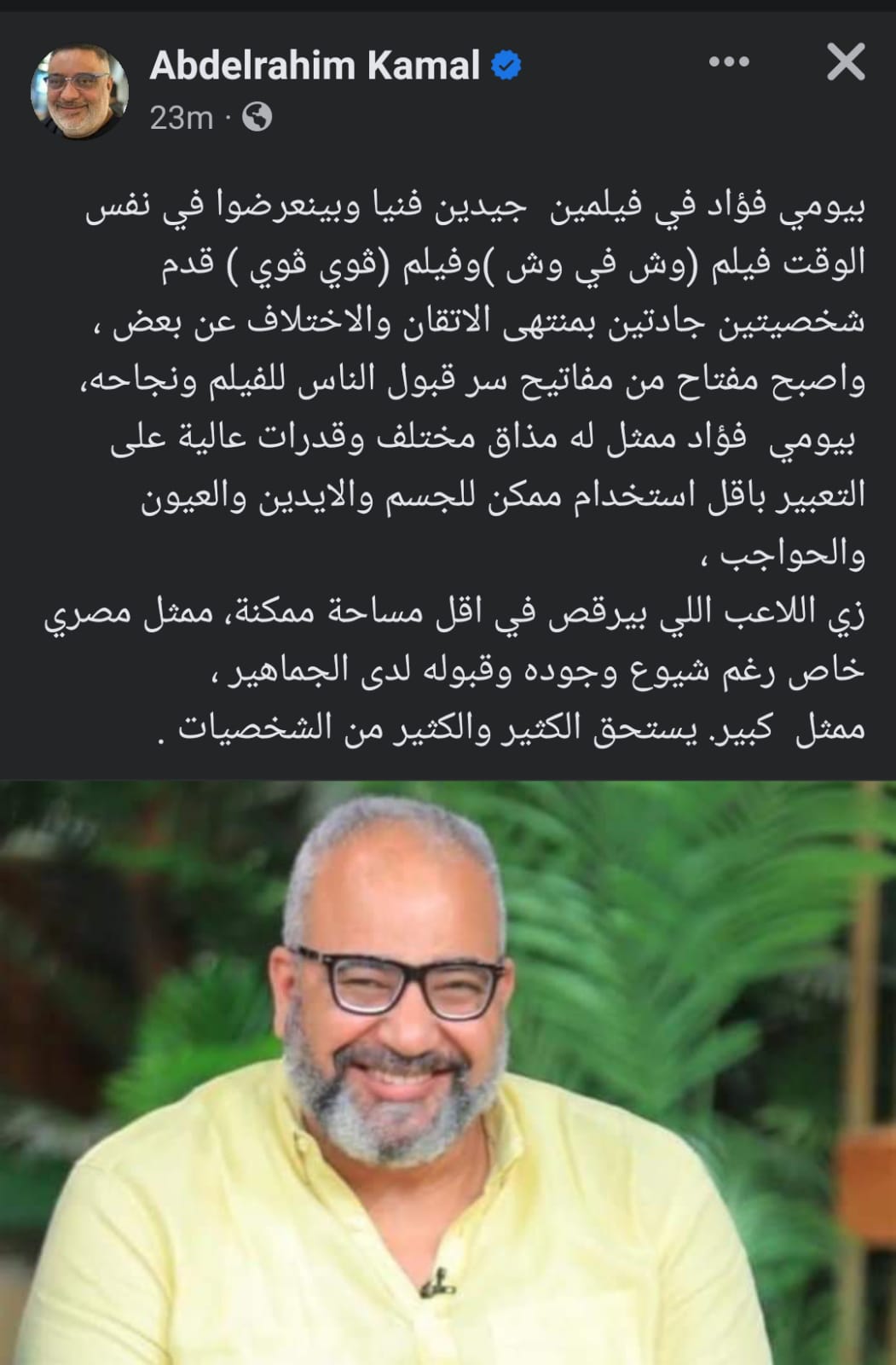 أشاد السيناريست و الكاتب الكبير عبد الرحيم كمال ببيومي فؤاد و ذلك عندما قدم دورين في فيلم “ وش في وش ” و “ فوي فوي فوي ” و ذلك من خلال منشور كتبه عبد الرحيم كمال على صفحته الرسمية عبر موقع التواصل الاجتماعي “ فيسبوك ” .