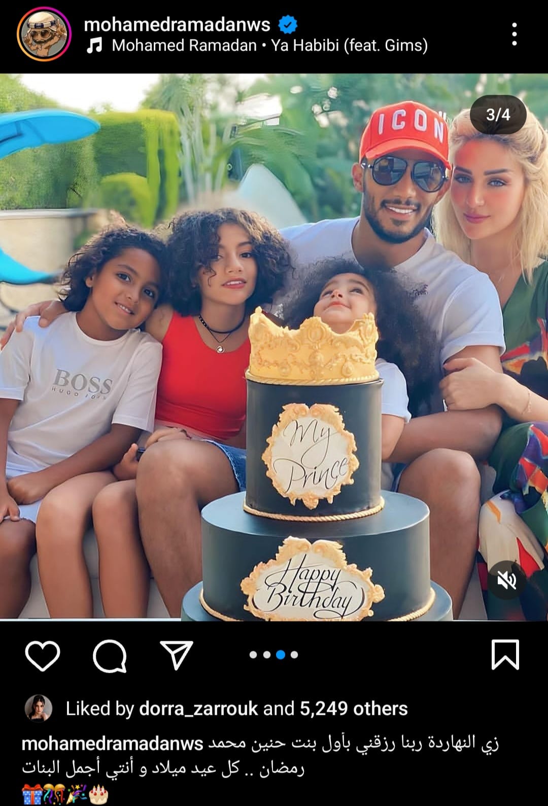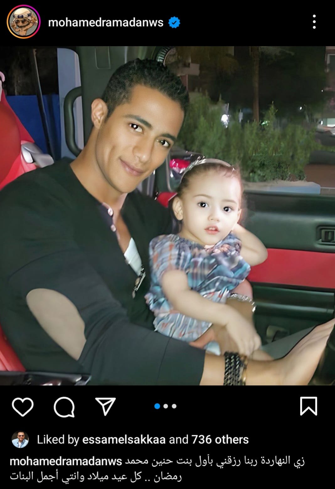 علق رمضان قائلا"زي النهاردة ربنا رزقني بأول بنت حنين محمد رمضان كل عيد ميلاد وأنتي أجمل البنات".