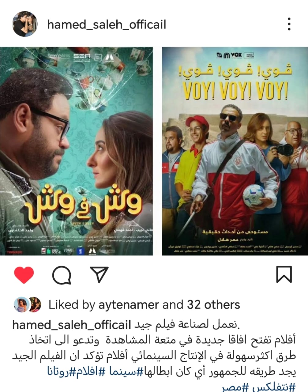 وجه المخرج والمنتج حامد صالح التحية لفيلم فوي فوي و وش في وش عبر صفحاته الخاصة عبر مواقع التواصل الاجتماعي المختلفة حيث قام بمشاركة الملصقات الدعائية للفيلمين معلقا " نعمل لصناعة فيلم جيد وأفلام تفتح افاقا جديدة في متعة المشاهدة.