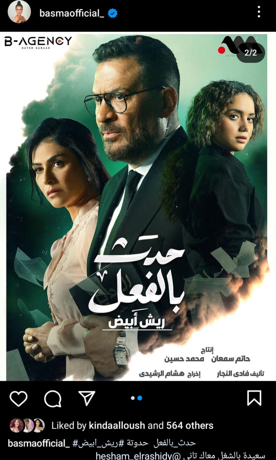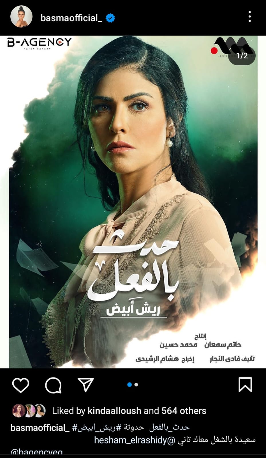 عبرت الفنانة بسمة عن سعادتها بالعمل مع المخرج هشام الرشيدي في مسلسل"حدث بالفعل" حكاية"ريش أبيض"بمشاركة جمهورها بعدة صورا لها من المسلسل حيث ظهر معها في الصور الفنان ماجد المصري والفنانة رنا رئيس،وذلك عبر حسابها الخاص بموقع تبادل الصور والفيديوهات"انستجرام".
