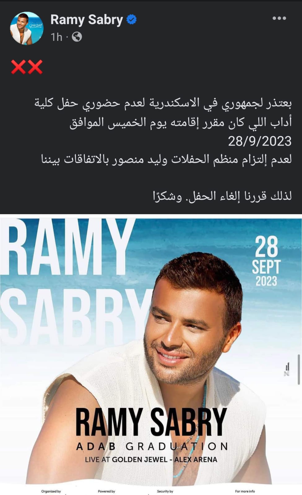 كتب رامي صبري منشور على صفحته الرسمية عبر موقع التواصل الاجتماعي “ فيسبوك ” و علق عليه قائلا “ بعتذر لجمهوري في الاسكندرية لعدم حضوري حفل كلية آداب اللي كان مقرر اقامته يوم الخميس الموافق 28/9/2023، لعدم التزام منظم الحفلات وليد منصور بالاتفاقات بيننا، لذلك قررنا الغاء الحفل، و شكرا ” .