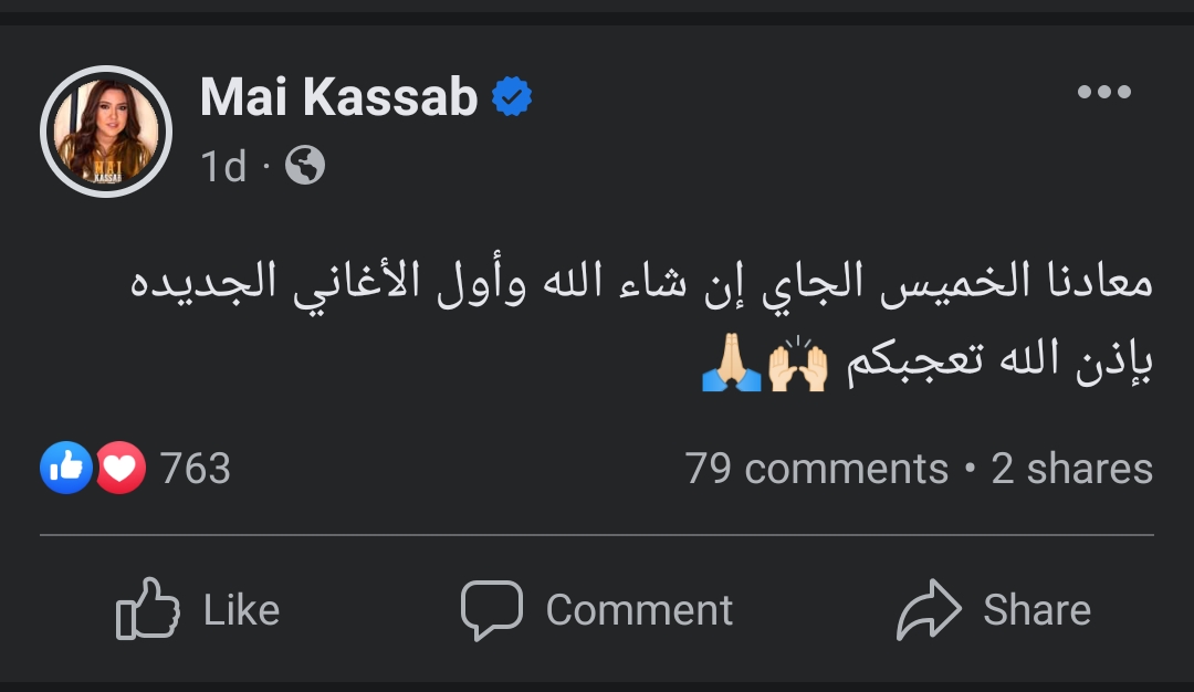 كتبت مي كساب منشور على صفحتها الرسمية عبر موقع التواصل الاجتماعي “ فيسبوك ” و علقت قائلة “ معادنا الخميس الجاي ان شاء الله و أول الأغاني الجديدة، بإذن الله تعجبكم ” .