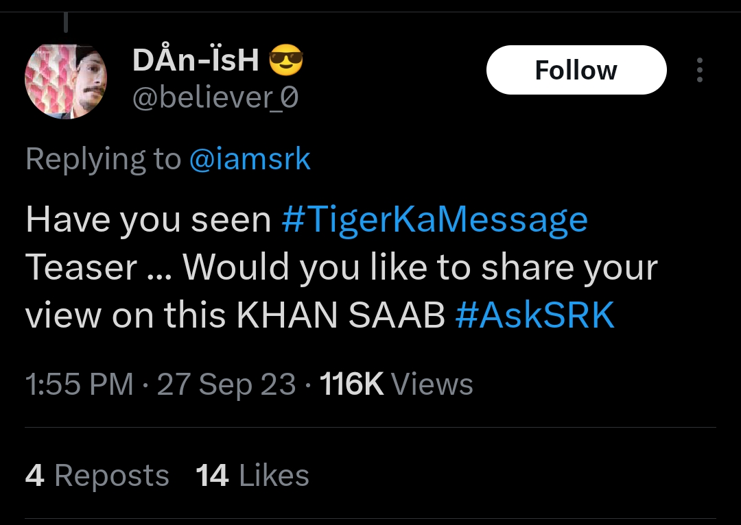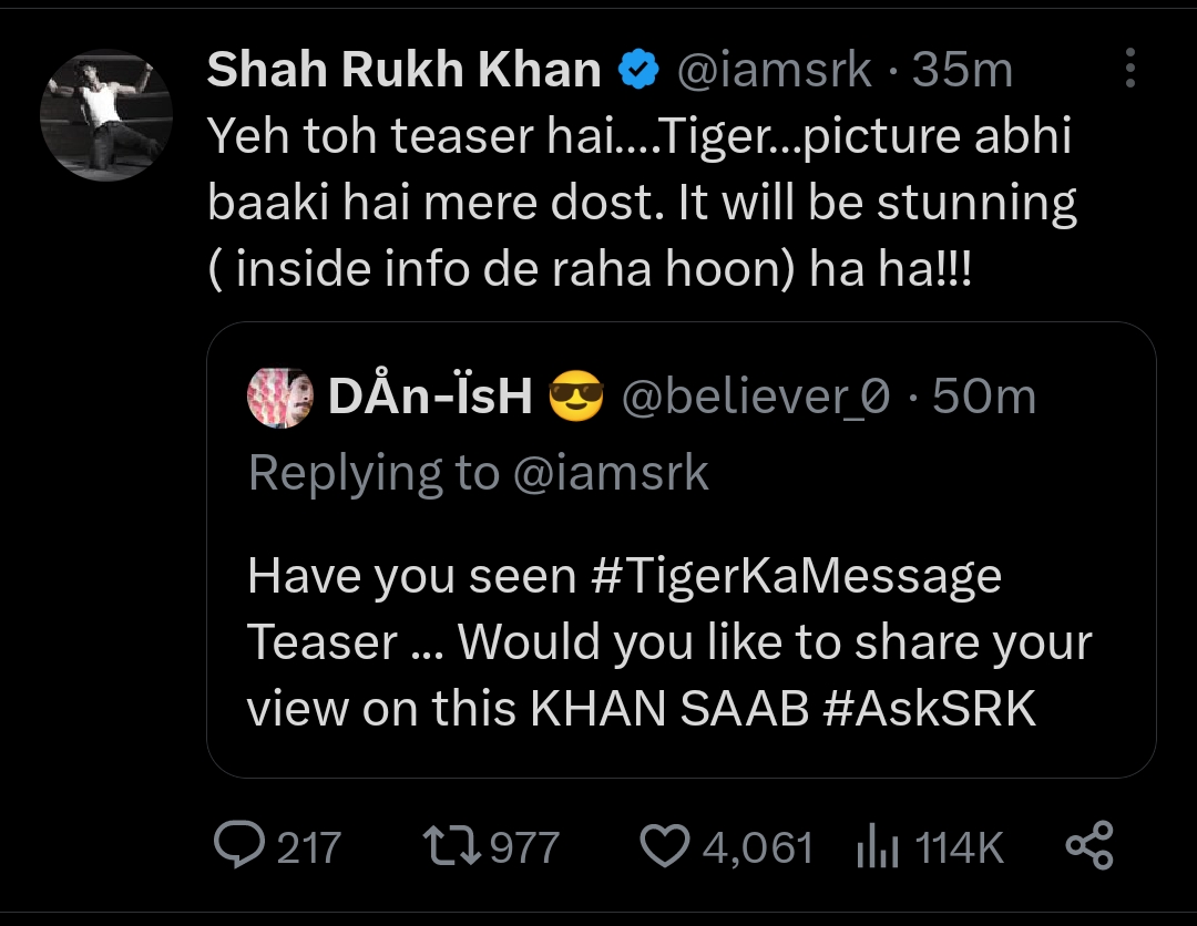 سأل أحد المتابعين شاروخان على موقع التواصل الاجتماعي “ تويتر ” : “ هل شاهدت اعلان فيلم Tiger ؟، هل تحب أن تشاركنا برأيك ؟ ”، ليرد عليه شاروخان “ هذا اعلان تشويقي .. Tiger .. الصورة لا تزال معلقة يا صديقي، و أنه سيكون مذهلا ” .