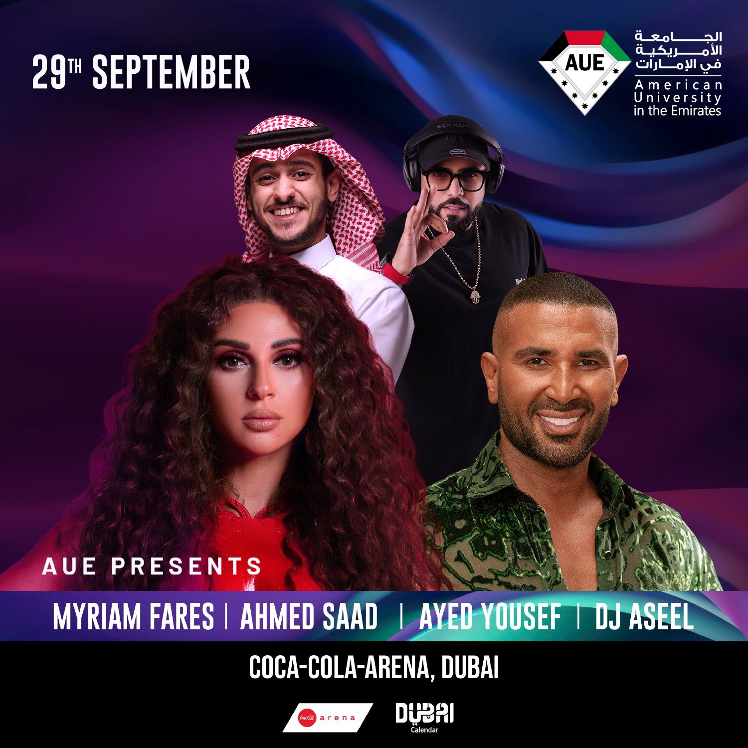وتحت تحت شعارها في جميع نشاطاتها "لا شيء مستحيل"، يجتمع في حفل تخرج الجامعة الأمريكية في الإمارات AUE الى جانب ميريام فارس، الفنان المصري المتميز أحمد سعد والفنانة الشاب السعودي "عايض" والفنانة العراقي "دي جي أصيل"، وذلك ضمن خطة وادارة الجامعة AUE في جعل حفل التخرج ذكرى أبدية يحتفل بها الخريجين وأهاليهم، والجمهور الذي سيقوم بحجز التذاكر لمشاركتهم هذه الفرحة، و لقاء نجومهم المطربين المشاركين في الحفل، من خلال توفير مقاعد يمكن حجزها من خلال الموقع الرسمي المعتمد لحجز التذاكر بالتعاون مع إدارة كوكاكولا أرينا في دبي.