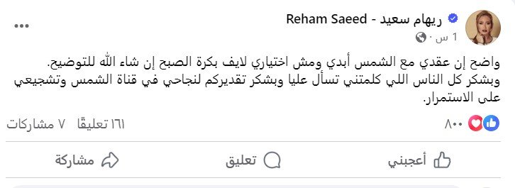 كتبت ريهام سعيد، خلال منشور لها، عبر حسابها الرسمي على موقع التواصل الاجتماعي "فيسبوك"، وكتبت: "أنا بعلن انسحابي من قناة الشمس.. لظروف شخصية، وعاوزة أقول إني اشتغلت مع أكتر ناس محترمة في الدنيا، وبتمنى التوفيق للجميع".