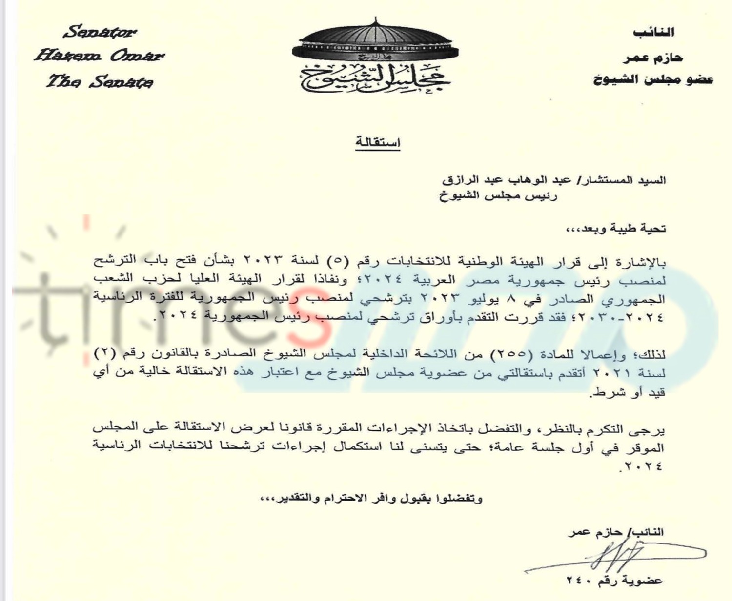 "مصر تايمز" ينشر نص استقالة حازم عمر من مجلس الشيوخ استعدادا للترشح لانتخابات الرئاسية