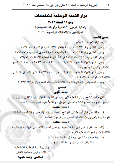 كما نشرت الجريدة الرسمية قرار الهيئة الوطنية للانتخابات رقم 19 لسنة 2023 والذى تضمن تحديد الرموز الانتخابية وقواعد تخصيصها للمرشحين بالانتخابات الرئاسية 2024.
