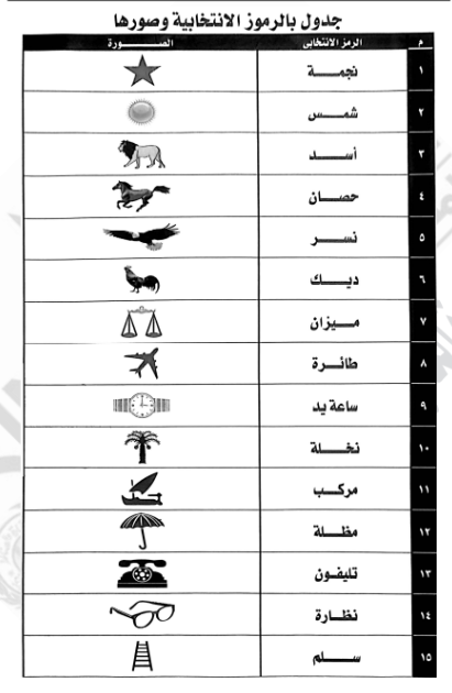 وتضمن جدول الرموز الانتخابية رمز النجمة والشمس والأسد والحصان والنسر والديك والميزان والطائرة وساعة اليد والنخلة والمركب والمظلة والتليفون والنظارة والسلم.