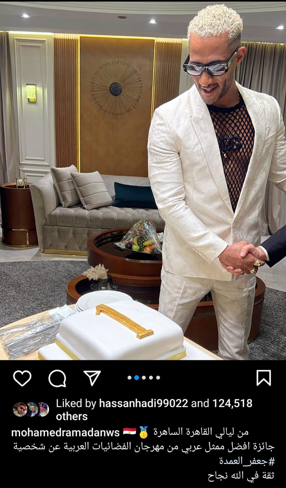 نشر الفنان محمد رمضان صورة على صفحته الرسمية عبر موقع تبادل الصور و الفيديوهات “ انستجرام ” و علق قائلا “ من ليالي القاهرة الساهرة .. جائزة أفضل ممثل عربي من مهرجان الفضائيات العربية عن شخصية جعفر العمدة .. ثقة في الله نجاح ” .