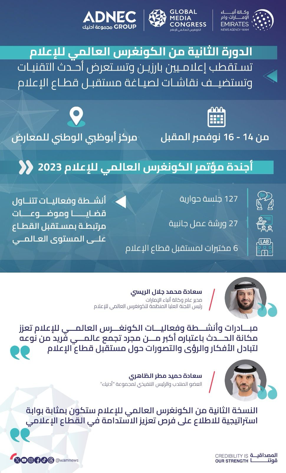 وقال سعادة محمد جلال الريسي، مدير عام وكالة أنباء الإمارات "وام" رئيس اللجنة العليا المنظمة للكونجرس العالمي للإعلام:" تجمع الدورة الثانية من الكونغرس العالمي للإعلام مجموعة من القادة والإعلاميين البارزين من دول العالم للتعمق في مناقشة وبحث مجموعة من القضايا والأفكار الجديدة التي يتناولها المؤتمر هذا العام، والتي تركز على توجهات القطاع في المستقبل في وقت بات فيه العالم أكثر تكاملاً من ذي قبل، وذلك إضافة إلى الدور الحيوي والمهم لمؤتمر الكونغرس العالمي للإعلام في توفير منصة لتعزيز أطر التعاون والشراكة بين المؤسسات والجهات الإعلامية من مختلف دول العالم".
