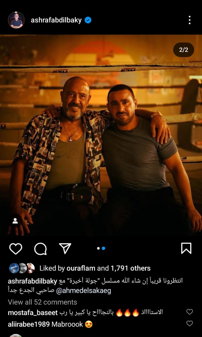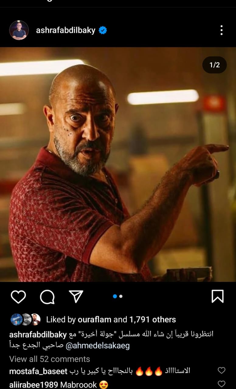 وعلق أشرف عبدالباقي قائلا "إنتظرونا قريبا إن شاء الله مسلسل"جولة أخيرة"مع صاحبي الجدع جدا أحمد السقا"،حيث نال الكثير من تعليقات من نجوم الفن أبرزهم مصطفى بسيط حيث كتب له"الأستاذ بالنجاح يا كبير يا رب،وأيضا علي ربيع حيث كتب"مبروك".