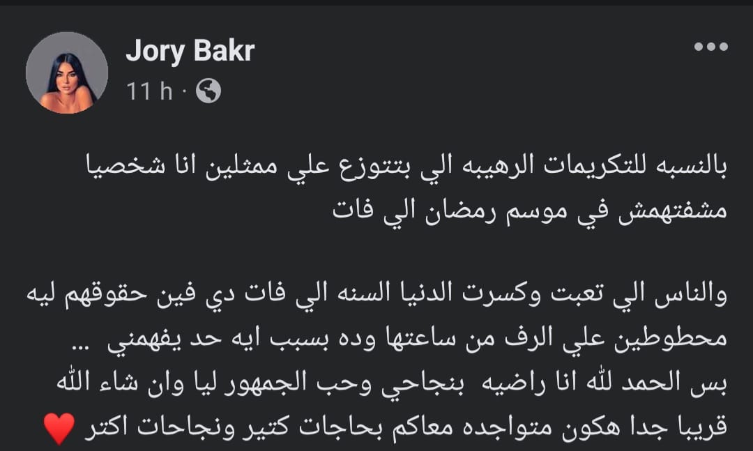 وقالت جوري بكر عبر صفحتها على مواقع التواصل الاجتماعى "بالنسبة للتكريمات الرهيبة الي بتتوزع علي ممثلين انا شخصيا مشفتهمش في موسم رمضان الي فات والناس الي تعبت وكسرت الدنيا السنة اللى فات دي فين حقوقهم ليه محطوطين علي الرف من ساعتها وده بسبب ايه حد يفهمني،بس الحمد لله انا راضيه بنجاحي وحب الجمهور ليا وان شاء الله قريبا جدا هكون متواجده معاكم بحاجات كتير ونجاحات أكتر".