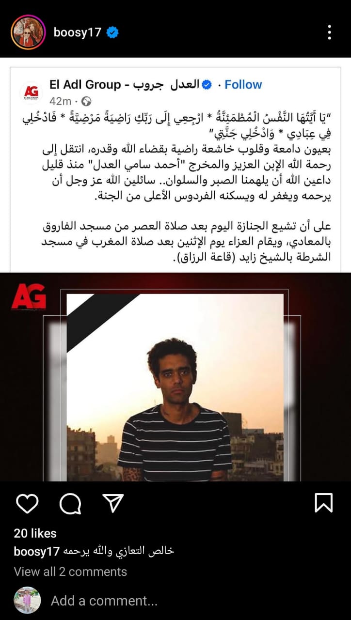وكتب الفنان أحمد وفيق منشور على صفحته الرسمية عبر موقع التواصل الاجتماعي “ فيسبوك ” و علق قائلا “ لا حول ولا قوة الا بالله .. أحمد سامي العدل في ذمة الله .. مع السلامة يا حبيبي، مع السلامة يا أبو قلب أبيض زي أبوك .. عزاءنا انك في مكان أفضل بجوار ربك .. ربنا يرحمك على قد طيبة قلبك يا حبيبي"