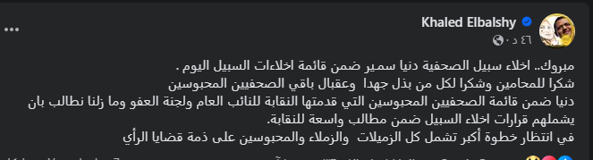 وأكد البلشي، أن النقابة، لاتزال تطالب بأن يشملهم قرارات اخلاء السبيل ضمن مطالب واسعة للنقابة، مشدداً علي أنها أنتظار النقابة خطوة أكبر تشمل كل الزميلات والزملاء والمحبوسين على ذمة قضايا الرأي.