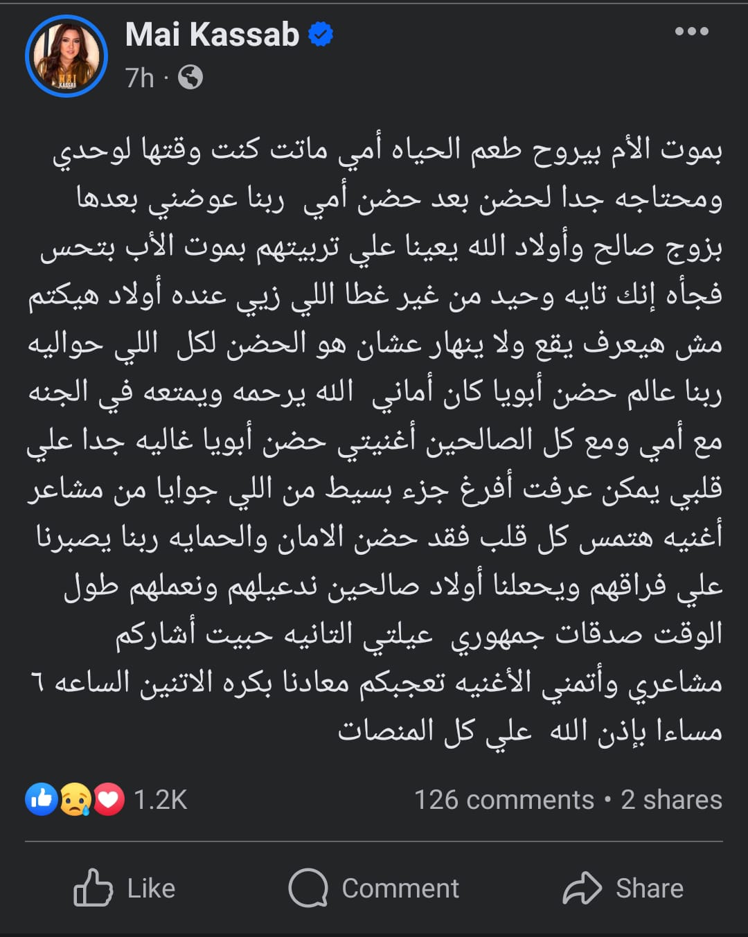 كتبت مي كساب منشور على صفحتها الرسمية عبر موقع التواصل الاجتماعي “ فيسبوك ” و علقت قائلة “ بموت الأم بيروح طعم الحياة، أمي ماتت كنت وقتها لوحدي و محتاجة جدا لحضن بعد حضن أمي، ربنا عوضني بعدها بزوج صالح و أولاد الله يعينا على تربيتهم ” .