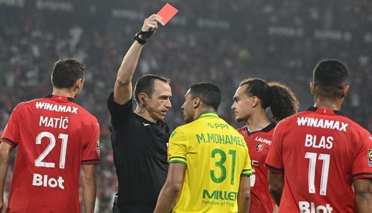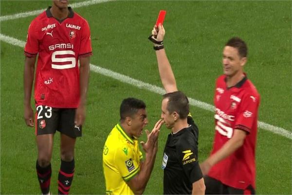 نانت ..وشهدت المباراة تعرض مصطفى محمد، للطرد في مباراة فريقه أمام رين بعد حصولة على إنذارين في دقيقتين متتاليتين "77، 78".