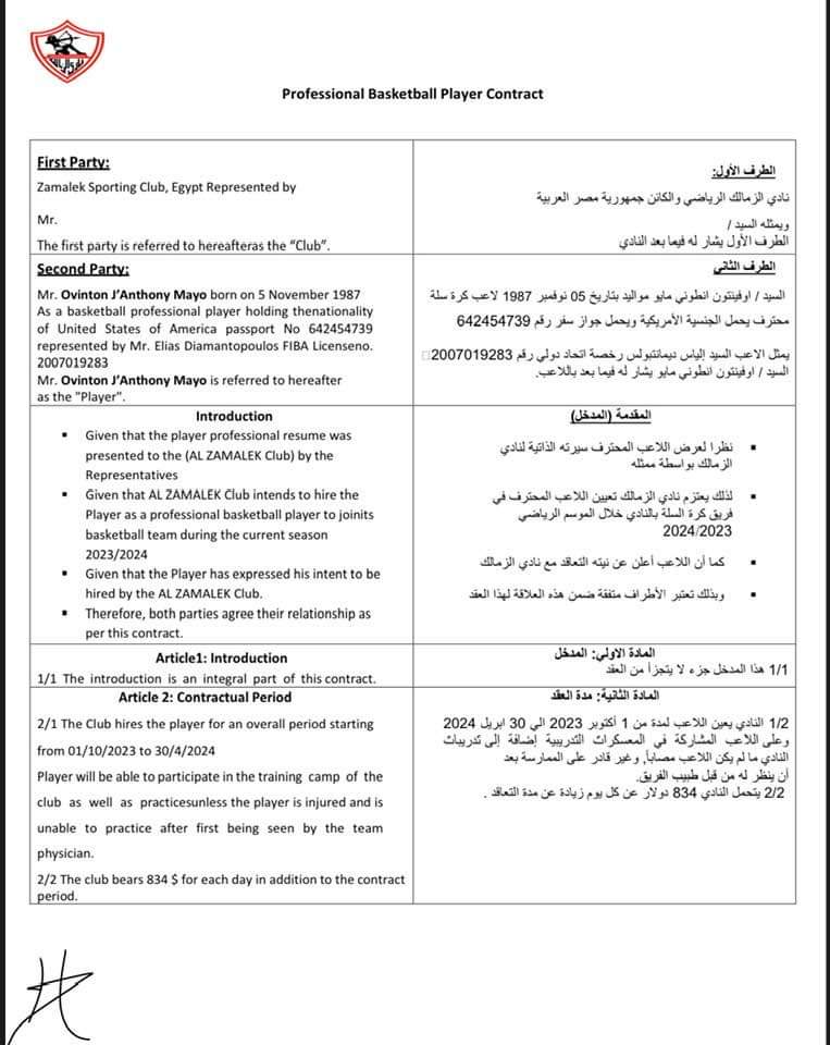 الزمالك ينجح في تجديد تعاقد أوجي مايو محترف السلة برعاية هشام نصر(صور)